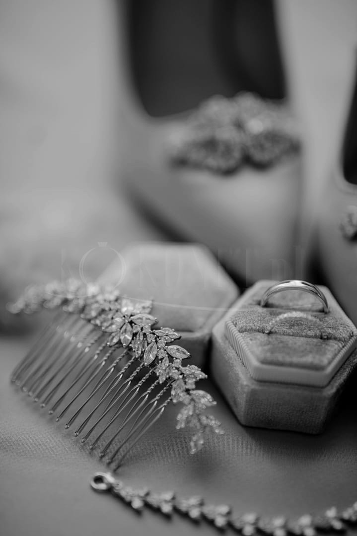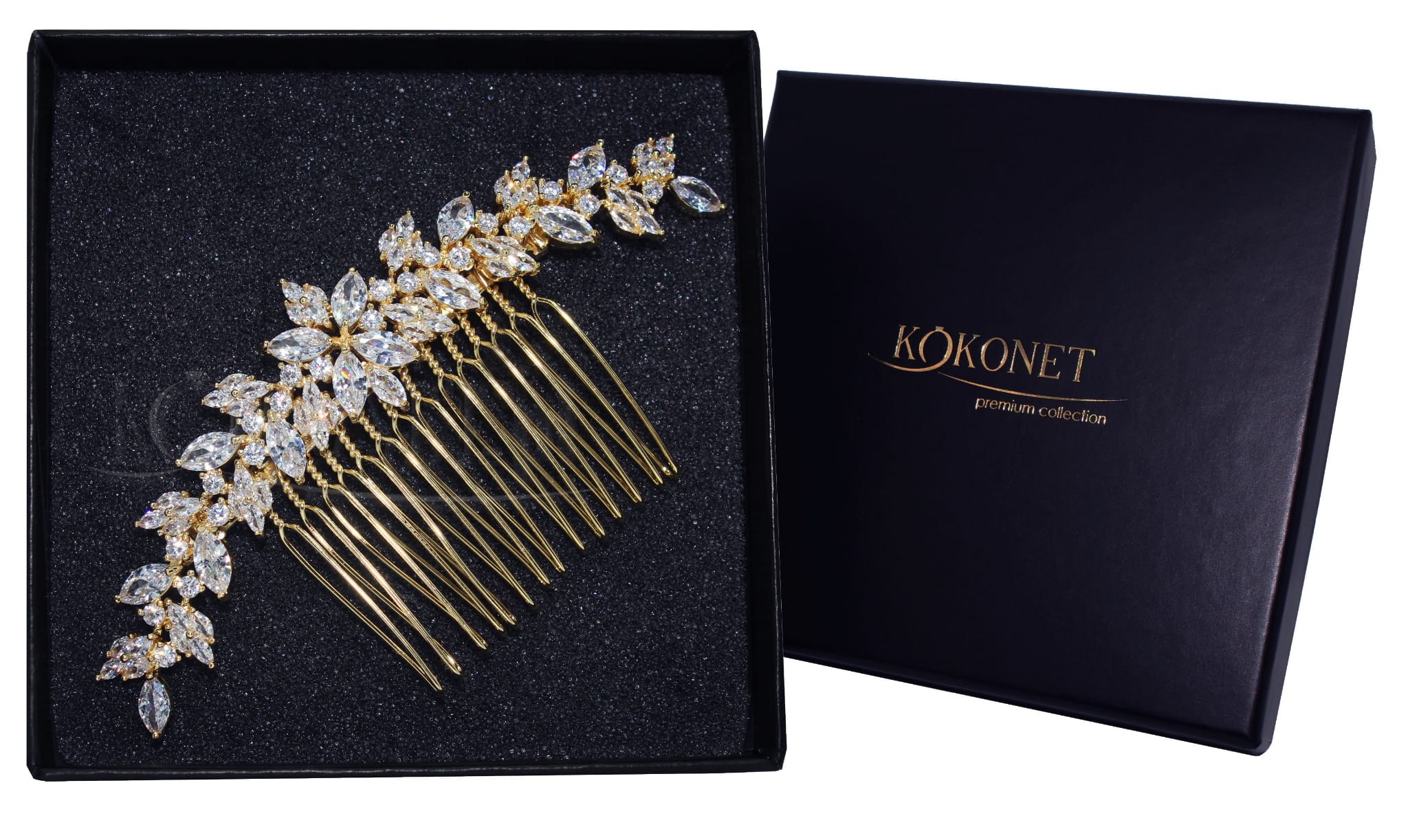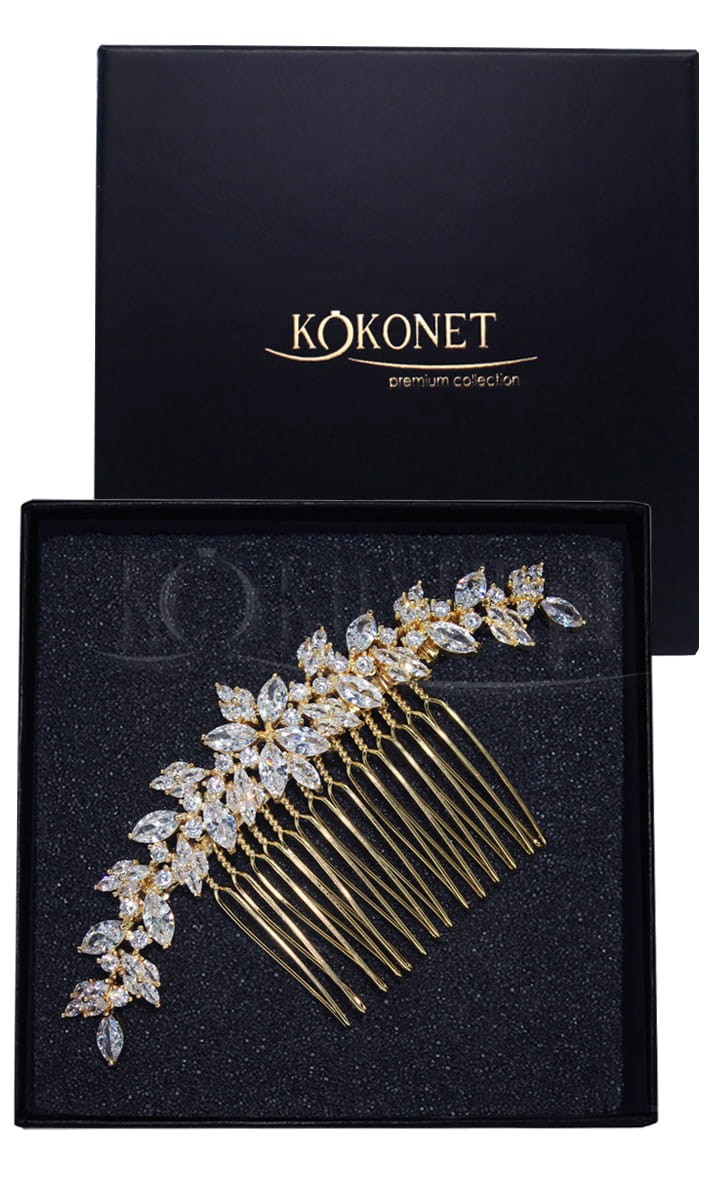 Złoty Grzebyk ślubny do włosów ASTRID został zaprojektowany tak, aby można go było skompletować dowolnie do większości modeli biżuterii ślubnej z serii premium. Podkreśli każde eleganckie upięcie, ale spokojnie będziesz go mogła dopasować również do swobodnie rozpuszczonych, lekko podpiętych fal w stylu hollywood.