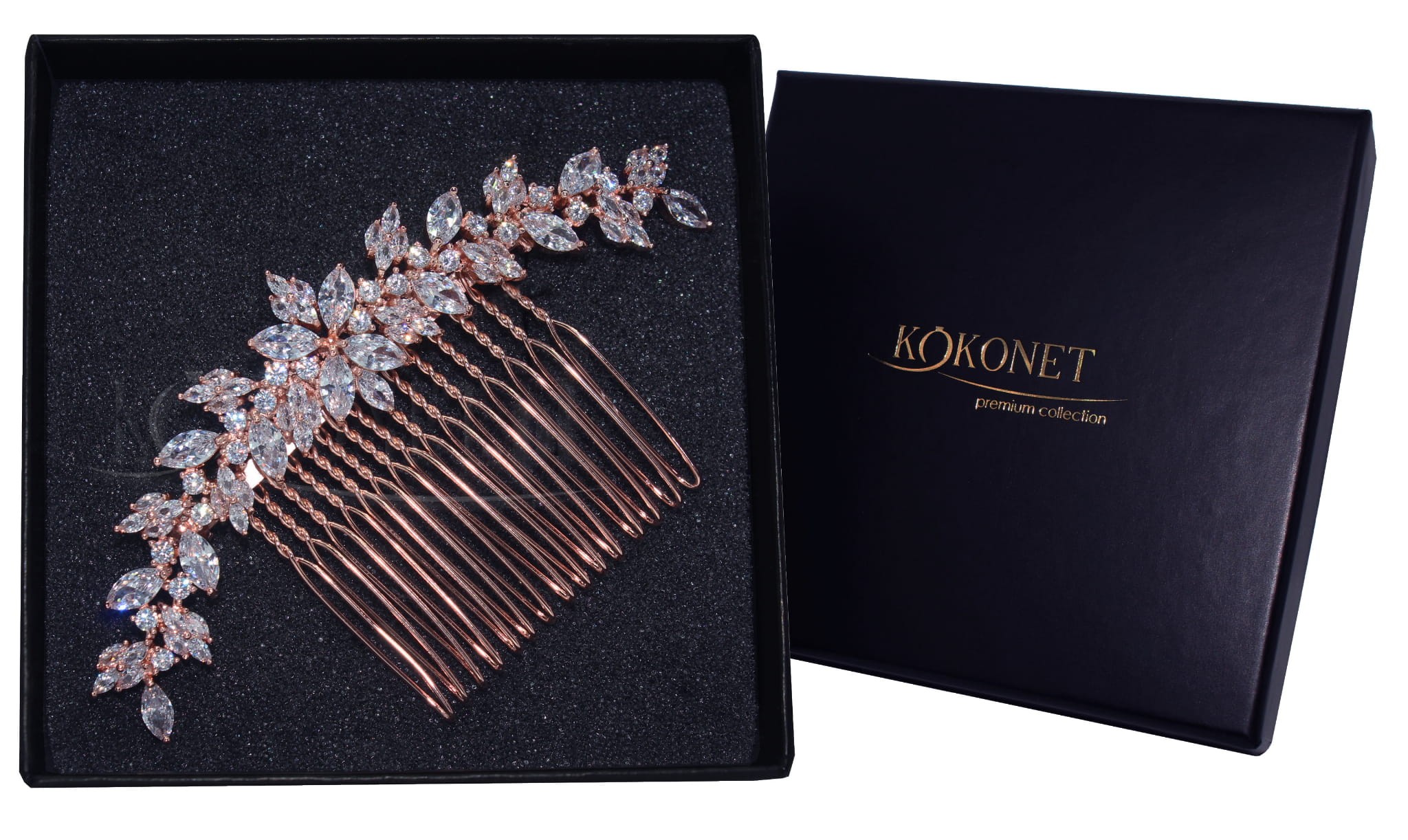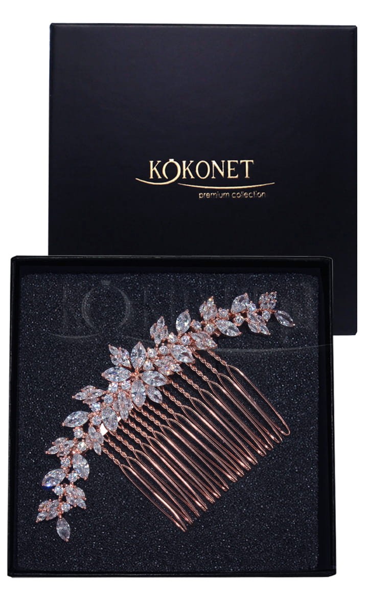 Grzebyk ślubny ASTRID w kolorze różowego złota został zaprojektowany tak, aby można go było skompletować dowolnie do większości modeli biżuterii ślubnej z serii premium. Podkreśli każde eleganckie upięcie, ale spokojnie będziesz go mogła dopasować również do swobodnie rozpuszczonych, lekko podpiętych fal w stylu hollywood.