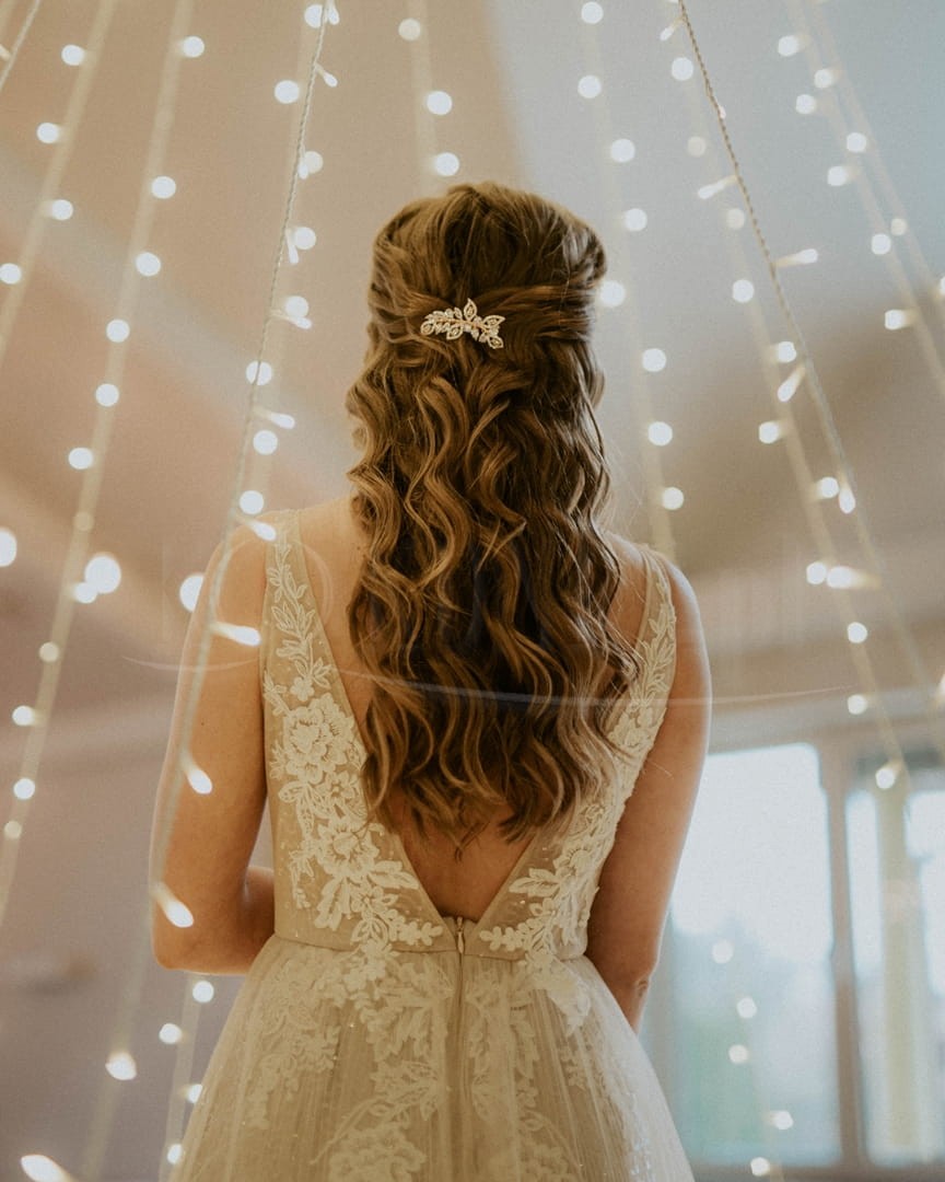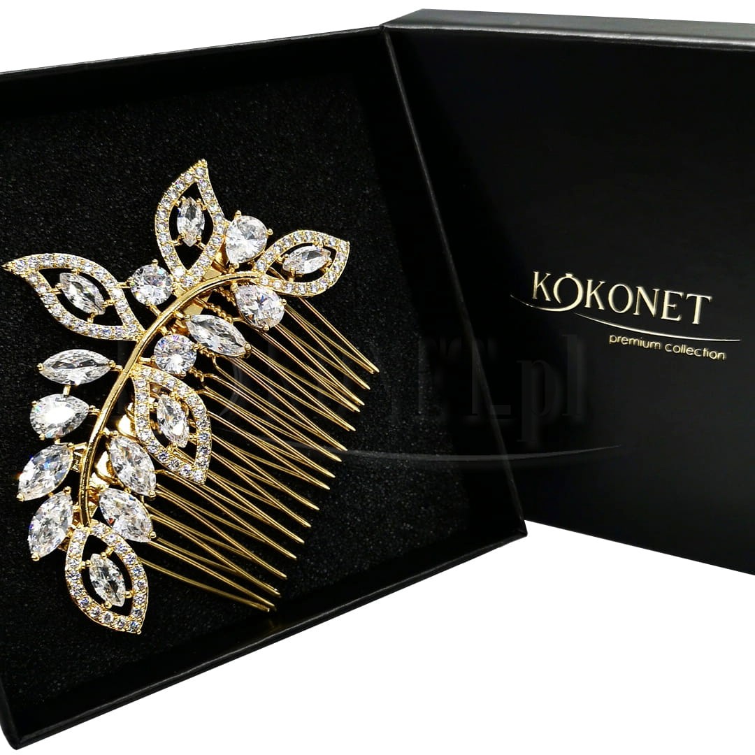 Grzebień ślubny JOVIE w kolorze złotym będzie odpowiedni, gdy planujesz niskie, gładkie upięcie ślubne, ale sprawdzi się również jako ozdoba dla podpiętych z jednej strony delikatnie pofalowanych pasm. Geometria ozdoby dopełni stylizacje gdzie motywem przewodnim będzie natura. Z tej serii polecamy również majestatyczne kolczyki ślubne i bransoletkę ślubną.