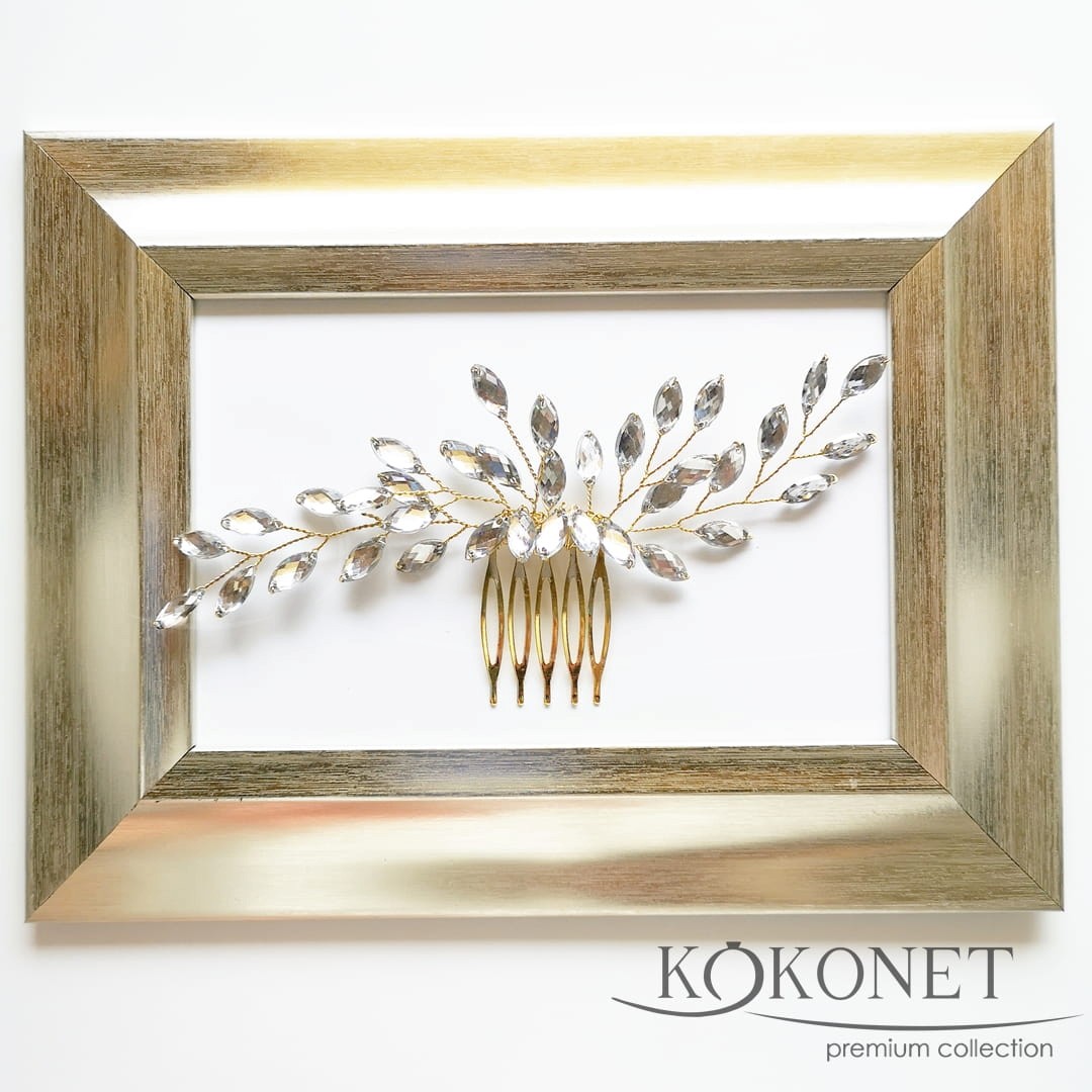 Grzebyk LUNA stanowi połączenie pięknie opalizujących kryształków w podłużnym kształcie ułożonych w formie romantycznie rozwianych listków. Ozdobę można zastosować do fantazyjnych upięć i półupięć z loków i fal.