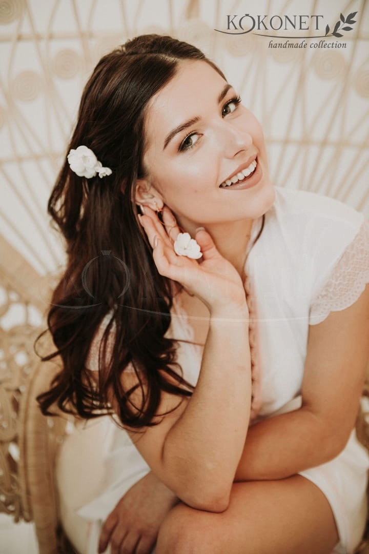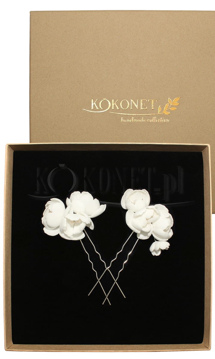 Srebrne kokówki PEONY to zdecydowanie ozdoba ślubna dla miłośniczek kwiatów, a w szczególności piwonii. Zestaw składa się z dwóch wsuwek; na jednej znajdują się trzy większe ,a na drugiej trzy większe i jeden mniejszy kwiatuszek ze środkami wykonanymi z koralików. Kwiaty można dowolnie ustawić względem fryzury tworząc interesujące przestrzenne, lub bardziej zbite kompozycje. Fryzura na ślub z ich udziałem wygląda romantycznie i lekko.