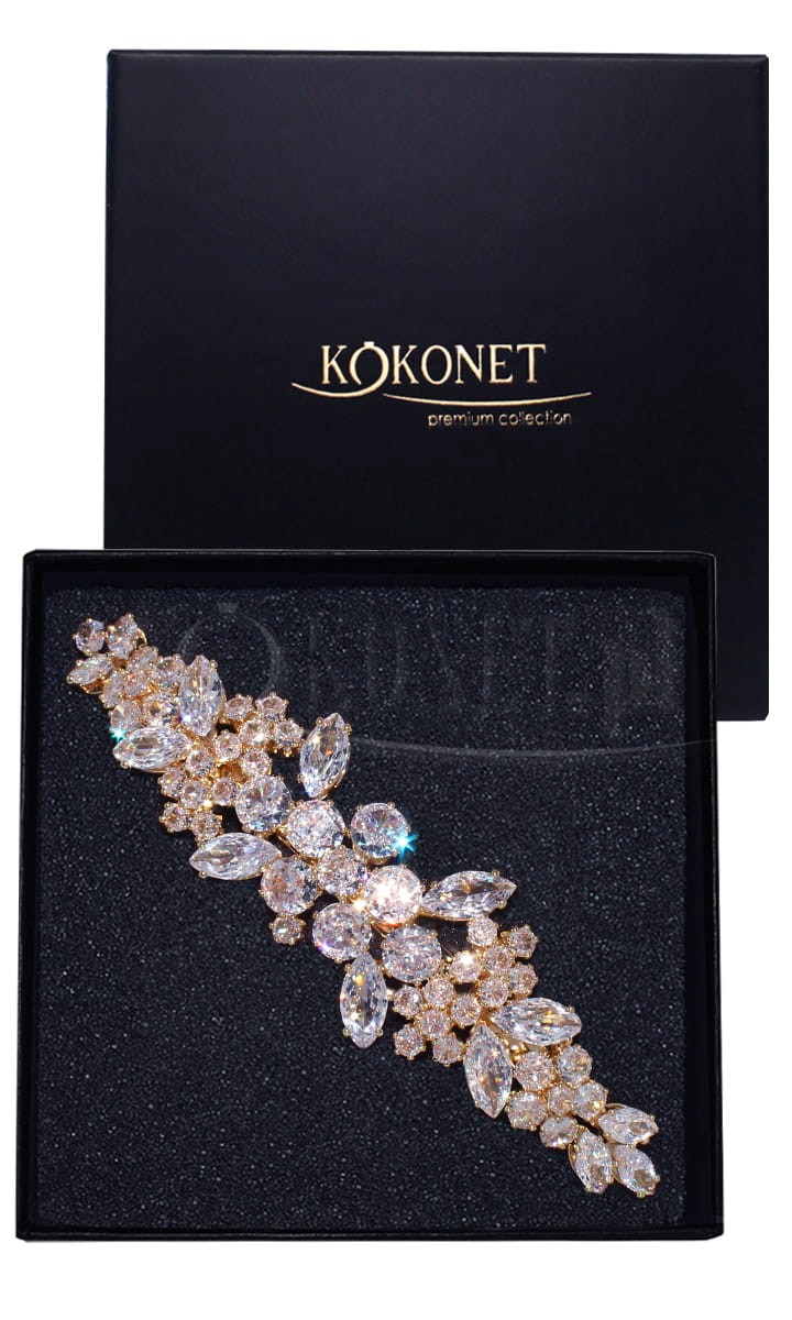 Efektowna złota spinka ślubna z motywem listków na zapięciu automatycznym podkreśli wszelkie eleganckie stylizacje ślubne, gdzie blask i klasa są pożądane. Smukły kształt tej ozdoby do włosów pięknie prezentuje się zwłaszcza wpięty za ucho, do wszelkiego rodzaju fal.