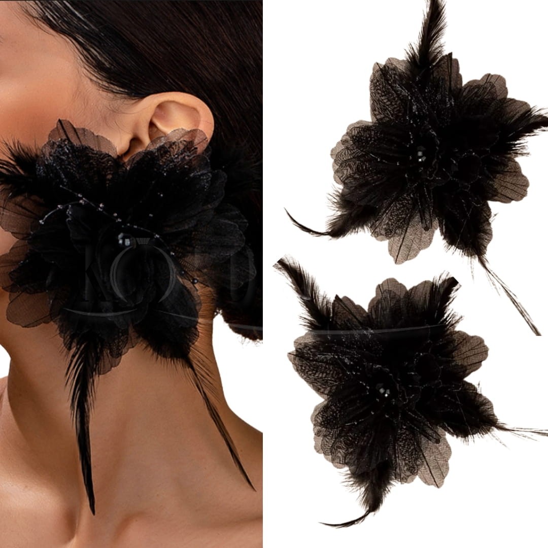 Okazałe i widowiskowe wręcz kolczyki z motywem dużego czarnego kwiatka 3d z pojedynczo wystającymi smukłymi piórami z pewnością będą odpowiednie do ciekawej i nietuzinkowej stylizacji, lub scenicznego wizerunku.