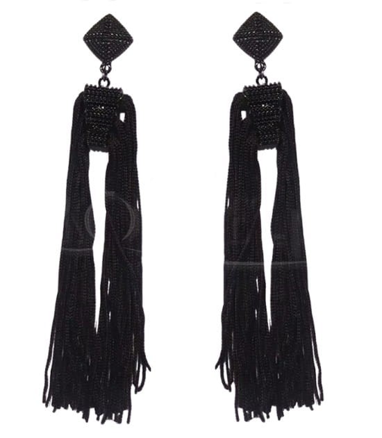 Długie kolczyki z frędzlami w kolorze czarnym idealnie wpiszą się w eleganckie stylizacje. Sznurki wykonane są z połyskującej tkaniny dzięki czemu kolczyki wyglądają szykownie.