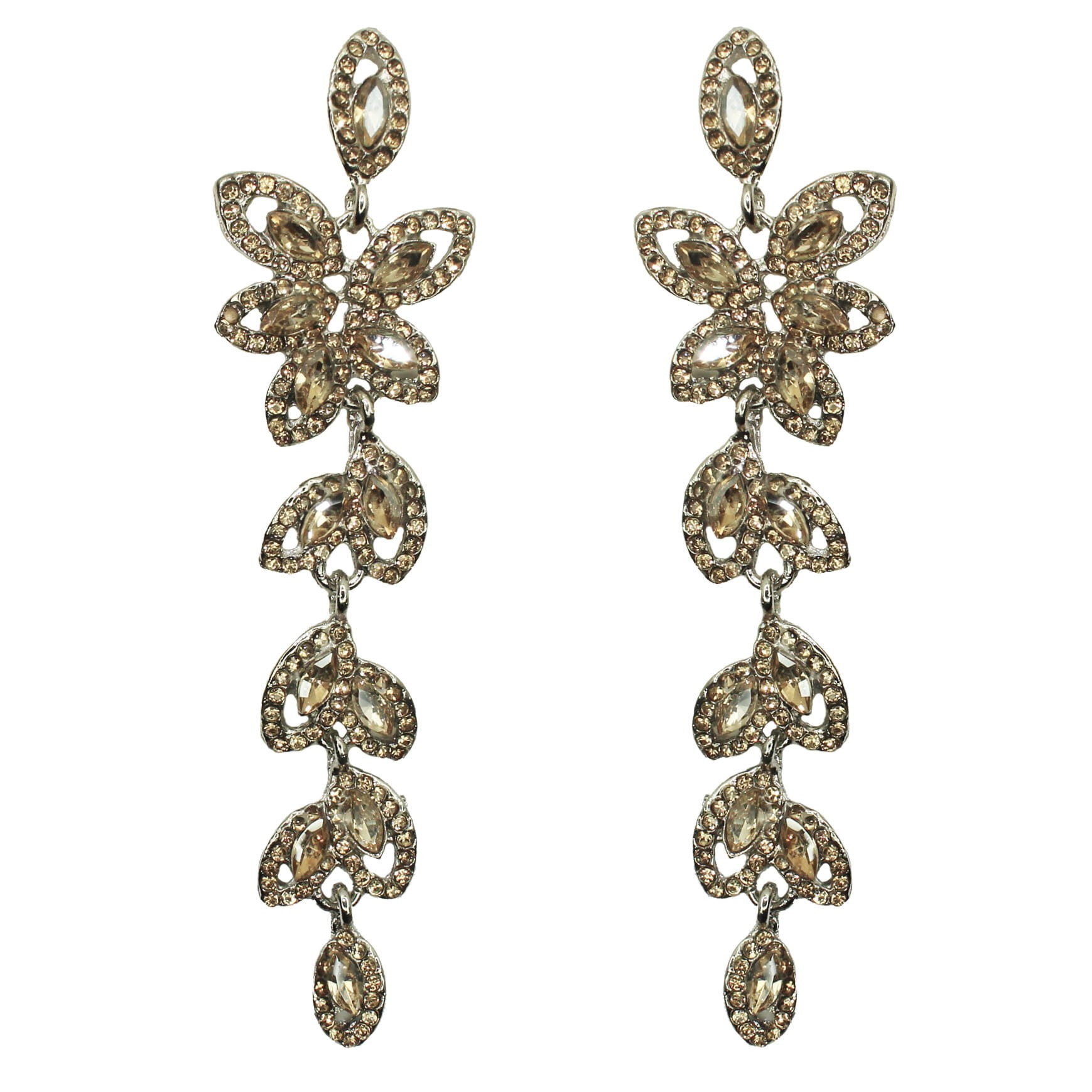 Długie srebrne kolczyki ślubne z cyrkoniami w kolorze szampana to zdecydowanie częsty wybór przyszłych mężatek zwłaszcza do sukni ślubnych w ciepłych odcieniach śmietanki, ecru, czy szampana. Kwiatowy wzór kolczyków z wiszącymi listkami dopełnia stylizacje w motywie rustykalnym, wprowadzając do nich blask.