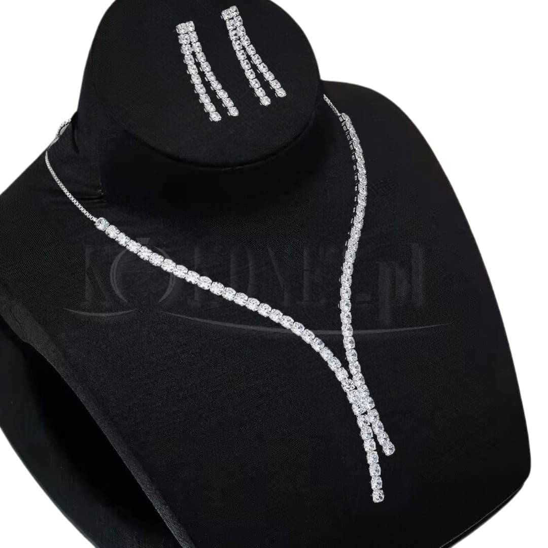 Zestaw eleganckiej biżuterii z cyrkoniami składający się z naszyjnika oraz prostych cykroniowych kolczyków to ozdoba efektowna i minimalistyczna do wieczorowego outfitu.