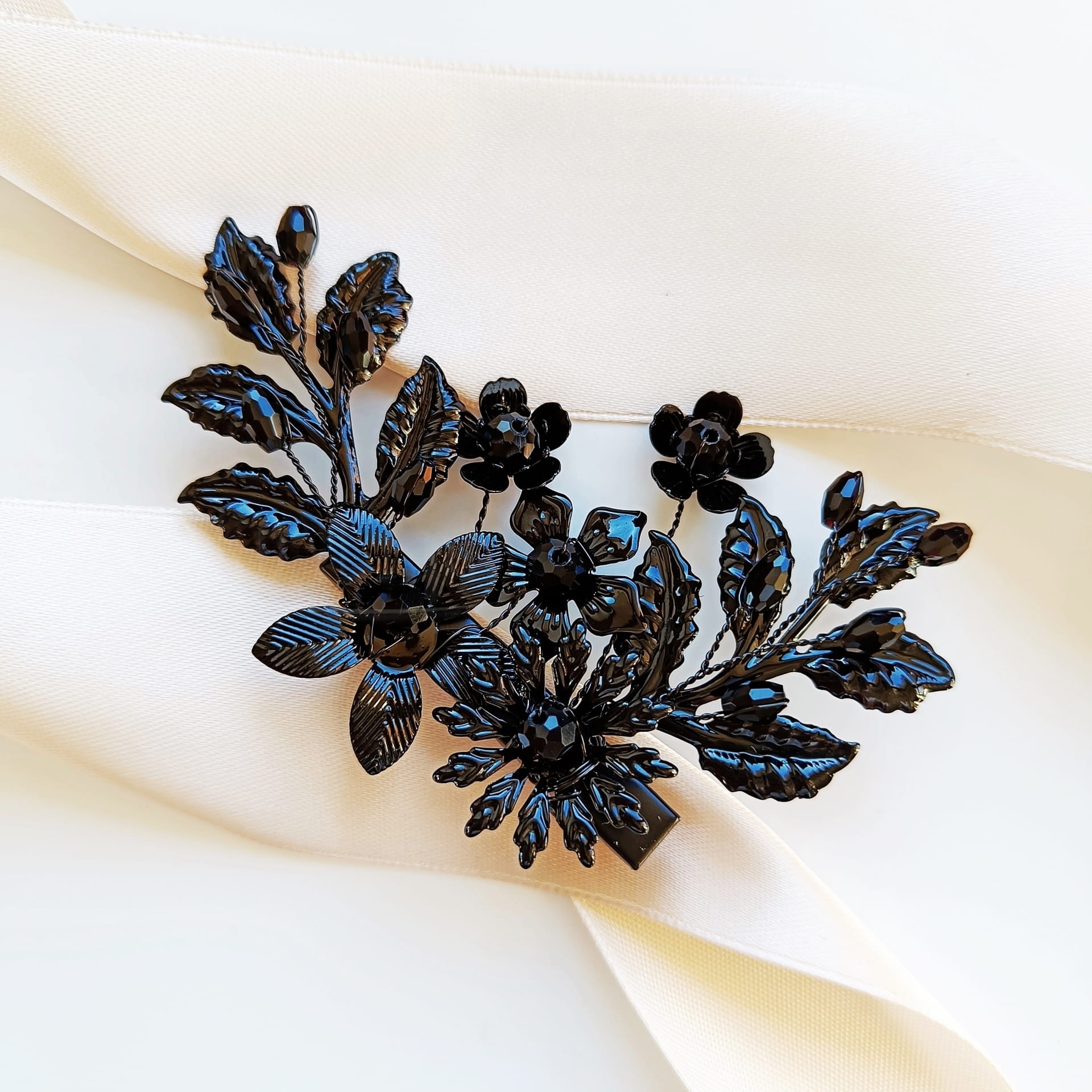 Czarna spinka do włosów z kwiatami i listkami to idealna ozdoba dla indywidualistek szukających nietuzinkowych dodatków. Ozdoba na włosy idealna na wiele okazji.