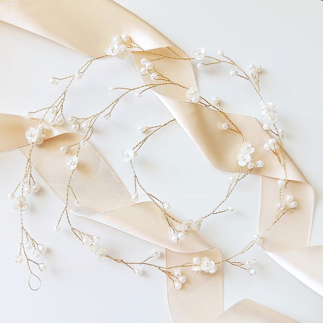 Delikatna długa girlanda do włosów z kwiatami i perłami złota