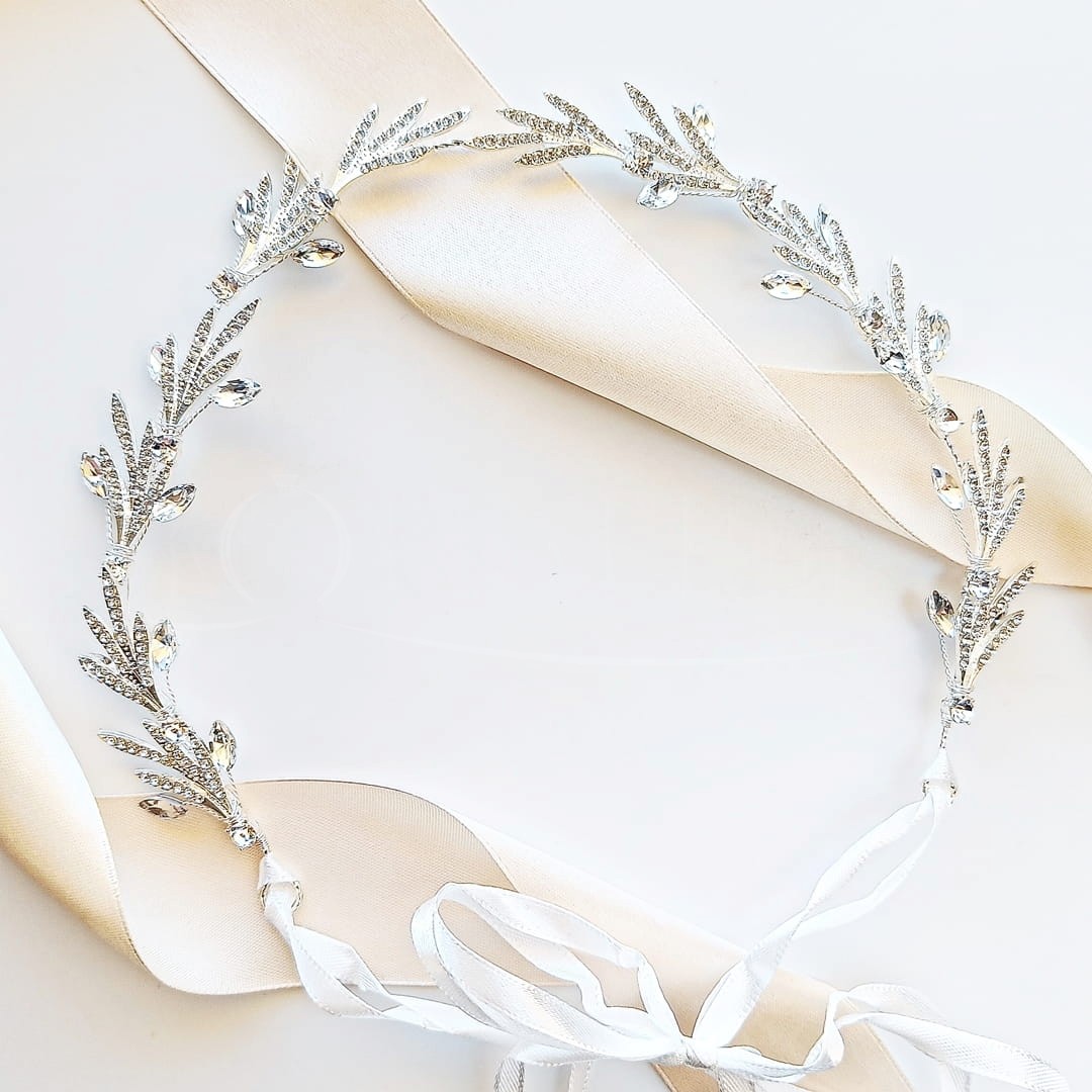 Fryzury rozpuszczone, jak i półupięcia zasługują na odrobinę ekstrawagancji w postaci ciekawej ozdoby. Taką ozdobą do włosów jest prezentowany tu srebrny wianek do włosów z elementami cyrkonii oraz listków wysadzanych małymi kryształkami. Ta srebrna ozdoba na żywo przepięknie prezentuje się na włosach elegancko połyskując w świetle. Wstążki dodawane do ozdoby możesz w każdej chwili ściągnąć aby z wianka zrobić gałązkę. Opaskę możesz dowolnie wygiąć aby najlepiej dopasować ją do swojej fryzury.