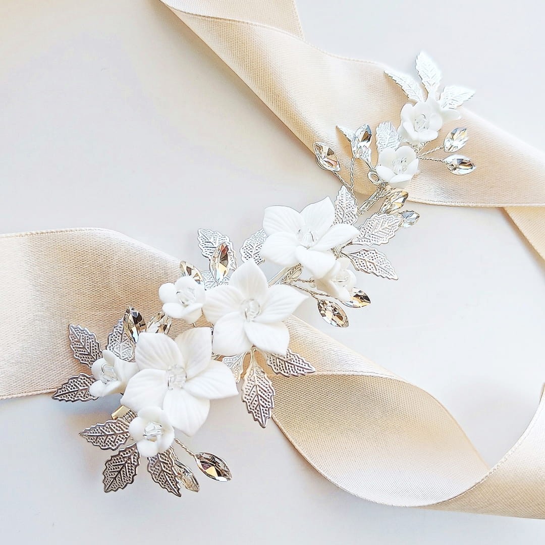 Spinki do włosów to zdecydowanie musthave większości ślubnych fryzur już od kilku sezonów. Przedstawiamy Ci srebrną spinkę na miarę trendy Panny Młodej w stylu boho glam. Spinka złożona jest z białych kwiatów z glinki, w towarzystwie metalowych i cyrkoniowych listków. Błyszczące elementy zwracają oczy w stronę upięcia, a w wieczorowym świetle bardzo ładnie go podkreślają. Dodatek kwiatów nadaje charakteru boho.