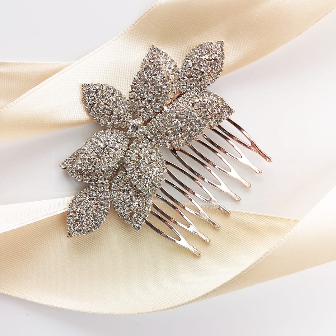 Grzebyk do włosów w kolorze różowego złota to w ostatnim czasie musthave większości ślubnych fryzur. Nic dziwnego bo dzięki nim całość nabiera kształtu, i stawia kropkę nad i wraz z odpowiednio dobraną biżuterią. Na poniższej aukcji przedstawiamy grzebyk w kolorze rose gold wysadzany cyrkoniami, którego motywem przewodnim są listki.