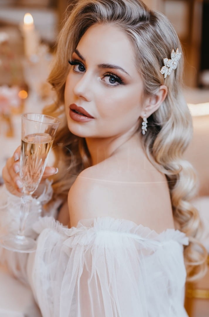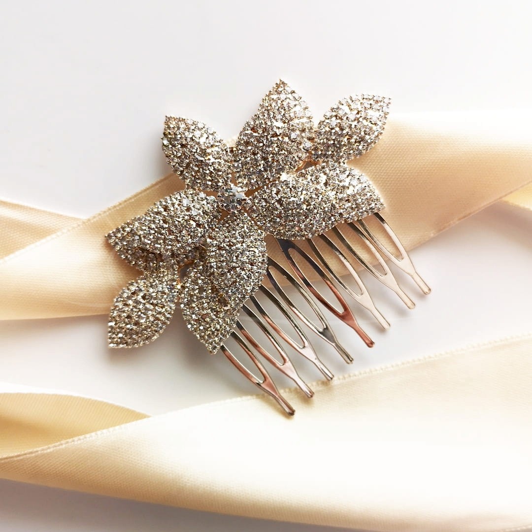 Złoty grzebyk ślubny do włosów to w ostatnim czasie często wybierana ozdoba do większości ślubnych fryzur. Nic dziwnego bo dzięki tym akcesoriom całość nabiera kształtu, i stawia kropkę nad i wraz z odpowiednio dobraną biżuterią ślubną. Na poniższej aukcji przedstawiamy grzebyk w kolorze złotym wysadzany cyrkoniami, którego motywem przewodnim są listki.