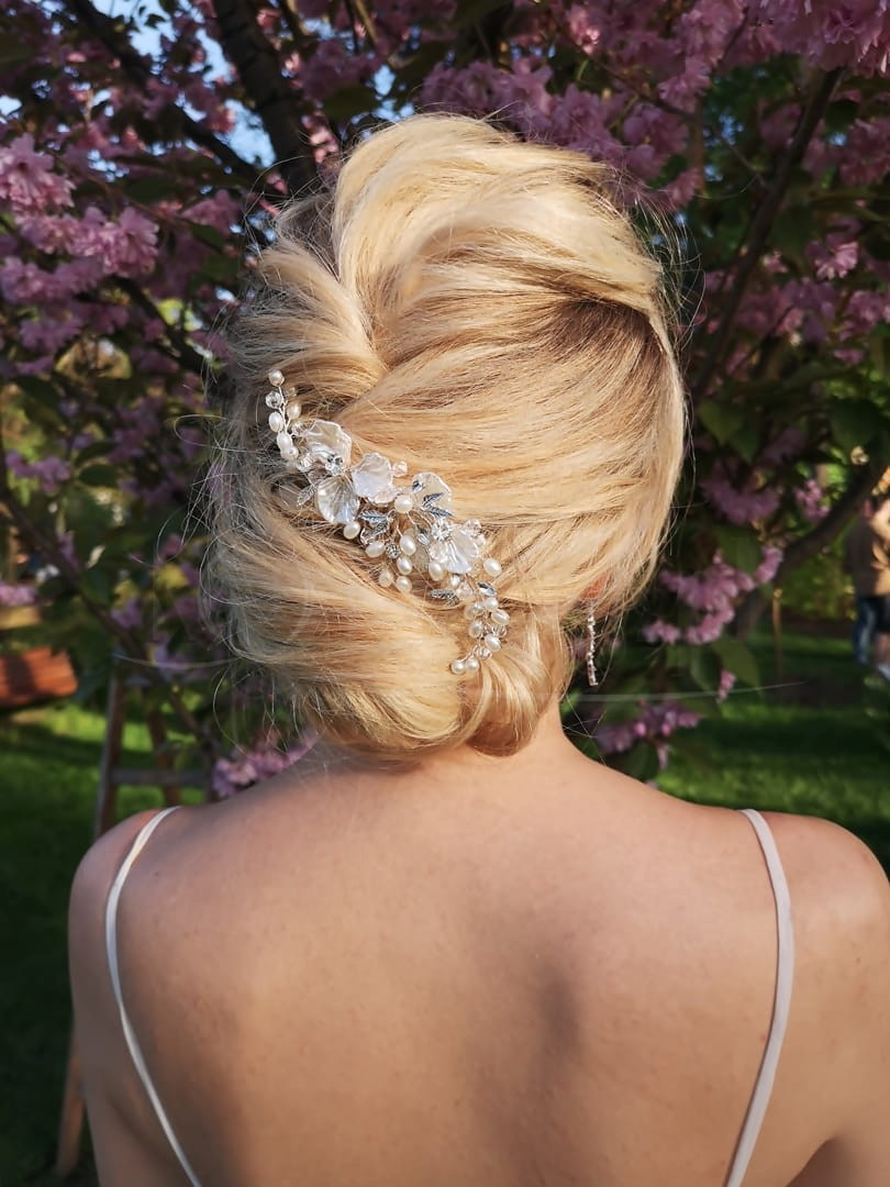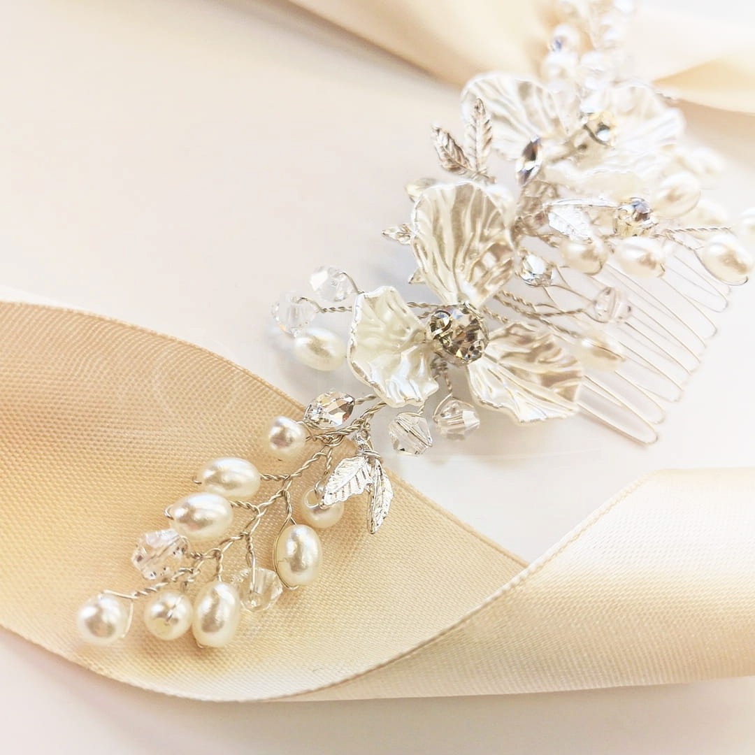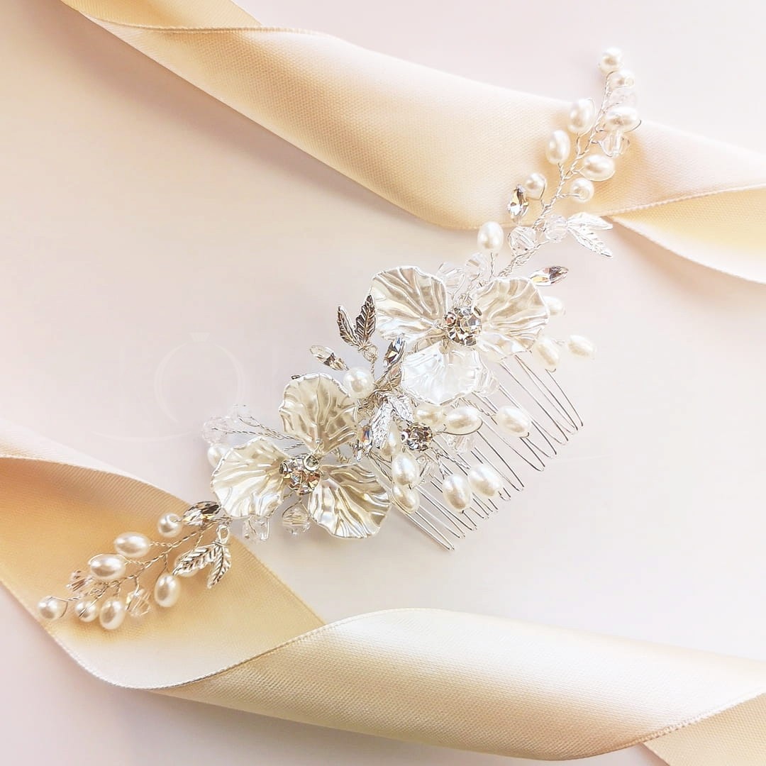 Grzebyk z motywem kwiatowym chętnie wybierany jest przez Panny Młode szukające uzupełnienia swojej ślubnej stylizacji o dodatki w stylu rustykalnym. Dodatek cyrkonii i kryształków sprawia, że ozdoba pięknie połyskuje we włosach.