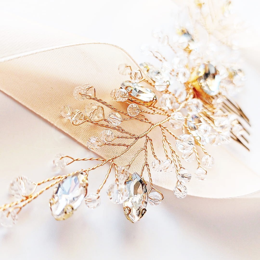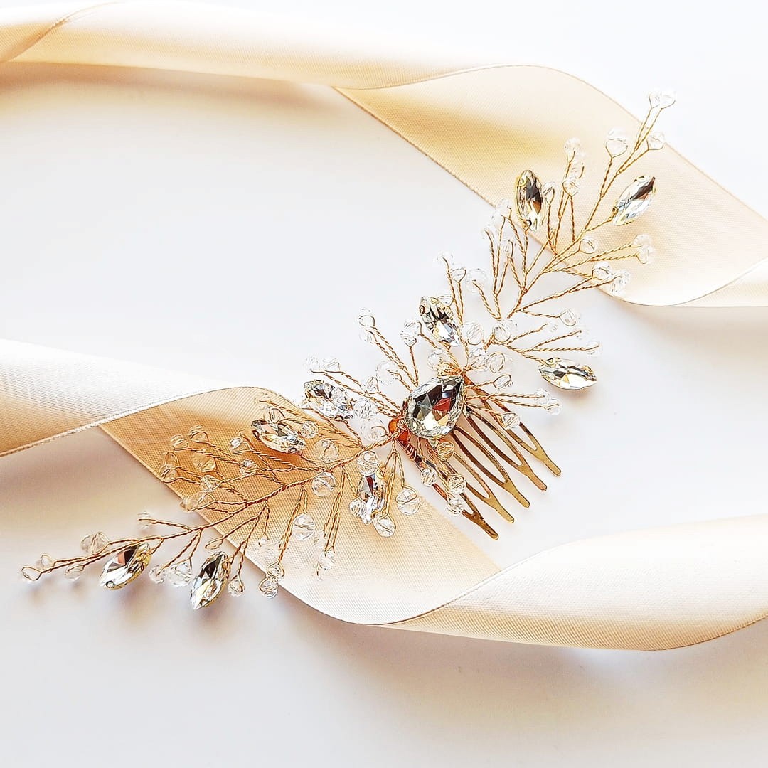 Okazały grzebyk do włosów złoty z kryształkami i cyrkoniami