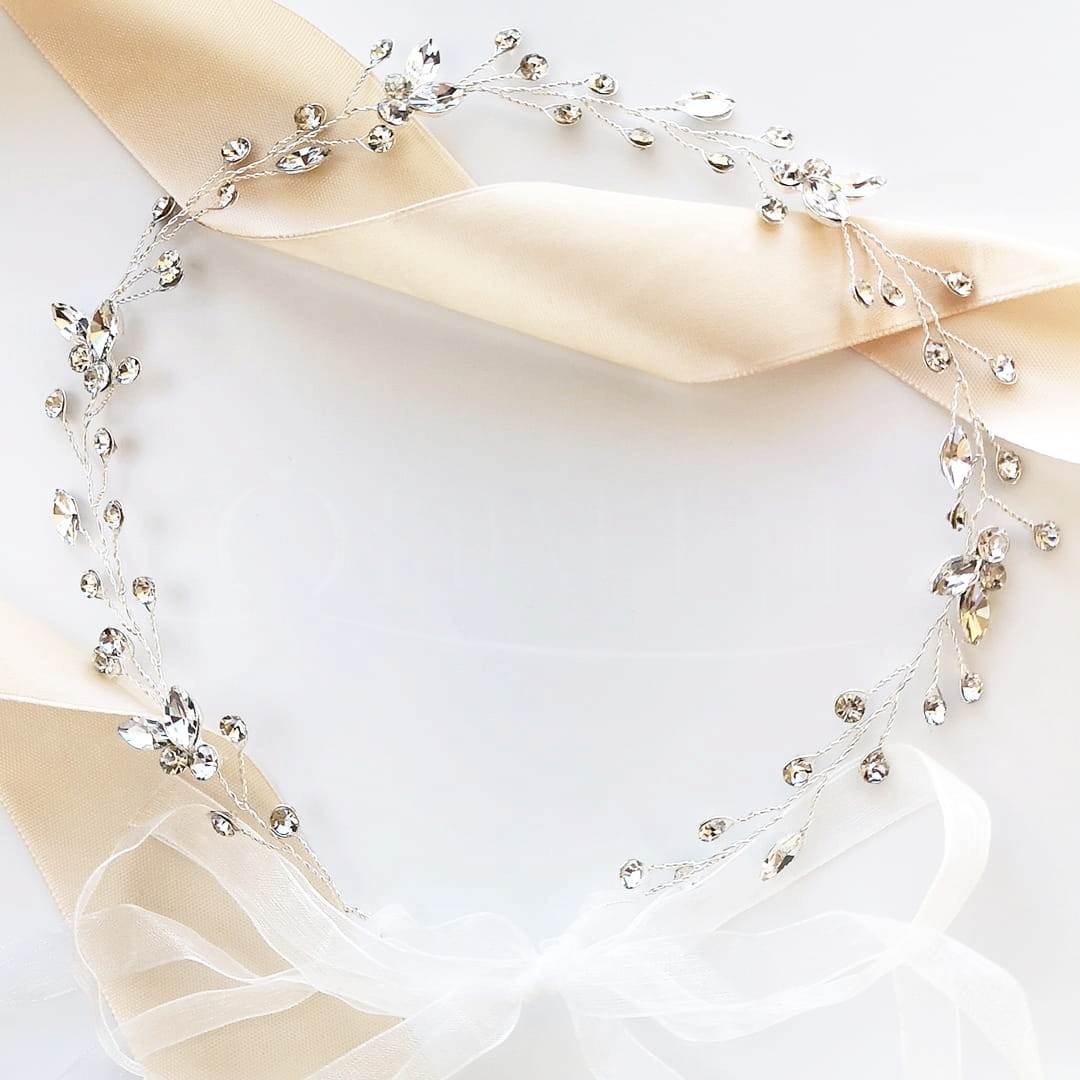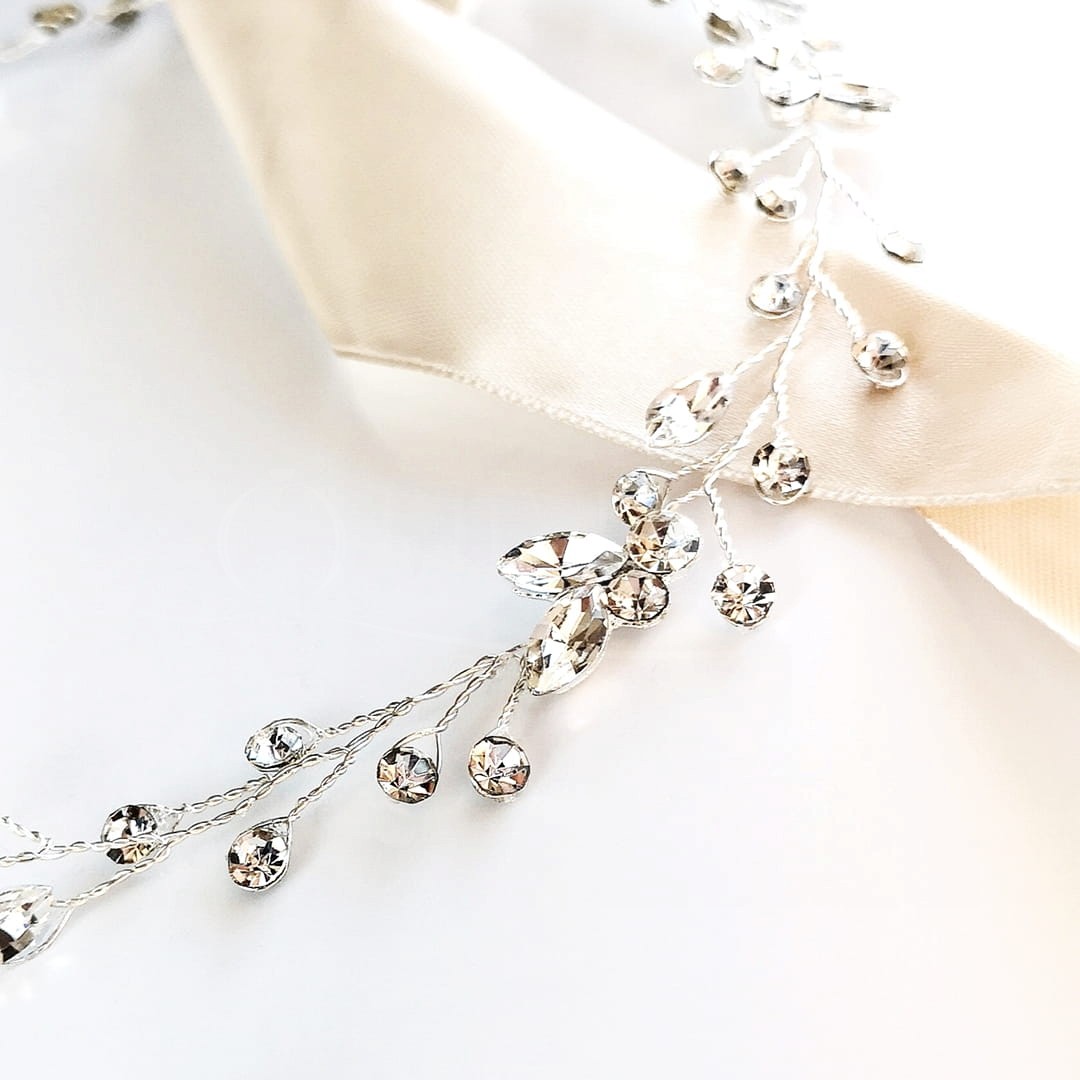 Ta opaska ślubna z ozdobnymi aplikacjami z cyrkonii w kształcie listków jest idealną ozdobą dla Panien Młodych szukających błyszczącej, ale niezbyt okazałej ozdoby ślubnej. Cyrkonie splecione na giętkim druciku możesz dowolnie formować - ściągając wstążkę zyskasz na możliwości uformowania ozdoby wokół koka czy innej ciekawej fryzury.