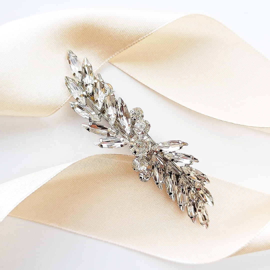 Efektowna ozdoba do włosów w postaci spinki z zapięciem na zatrzask to najchętniej wybierana ozdoba do włosów do fryzur w stylu fal hollywood, lub bocznych eleganckich upięć. Dzięki smukłemu kształtowi będzie pięknie podkreślać linię zaczesania, akcentując obecność biżuterii.