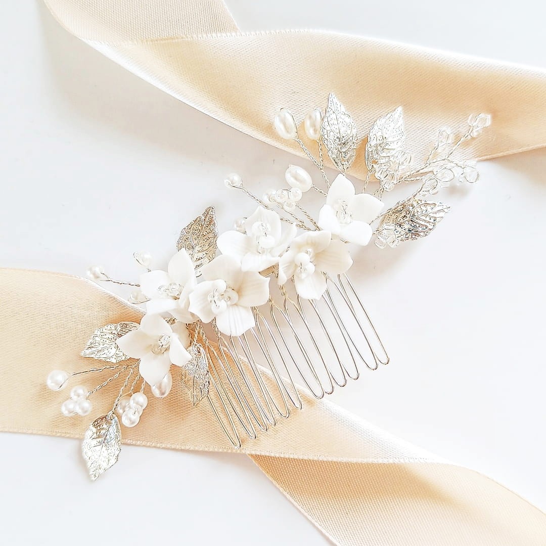 Srebrny grzebyk z białymi kwiatami perełkami i gałązkami