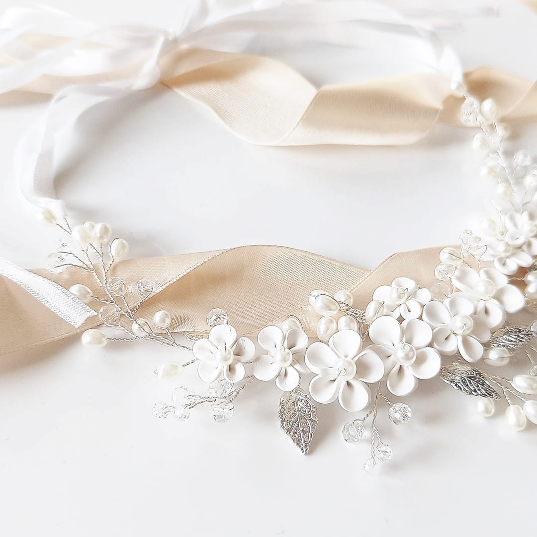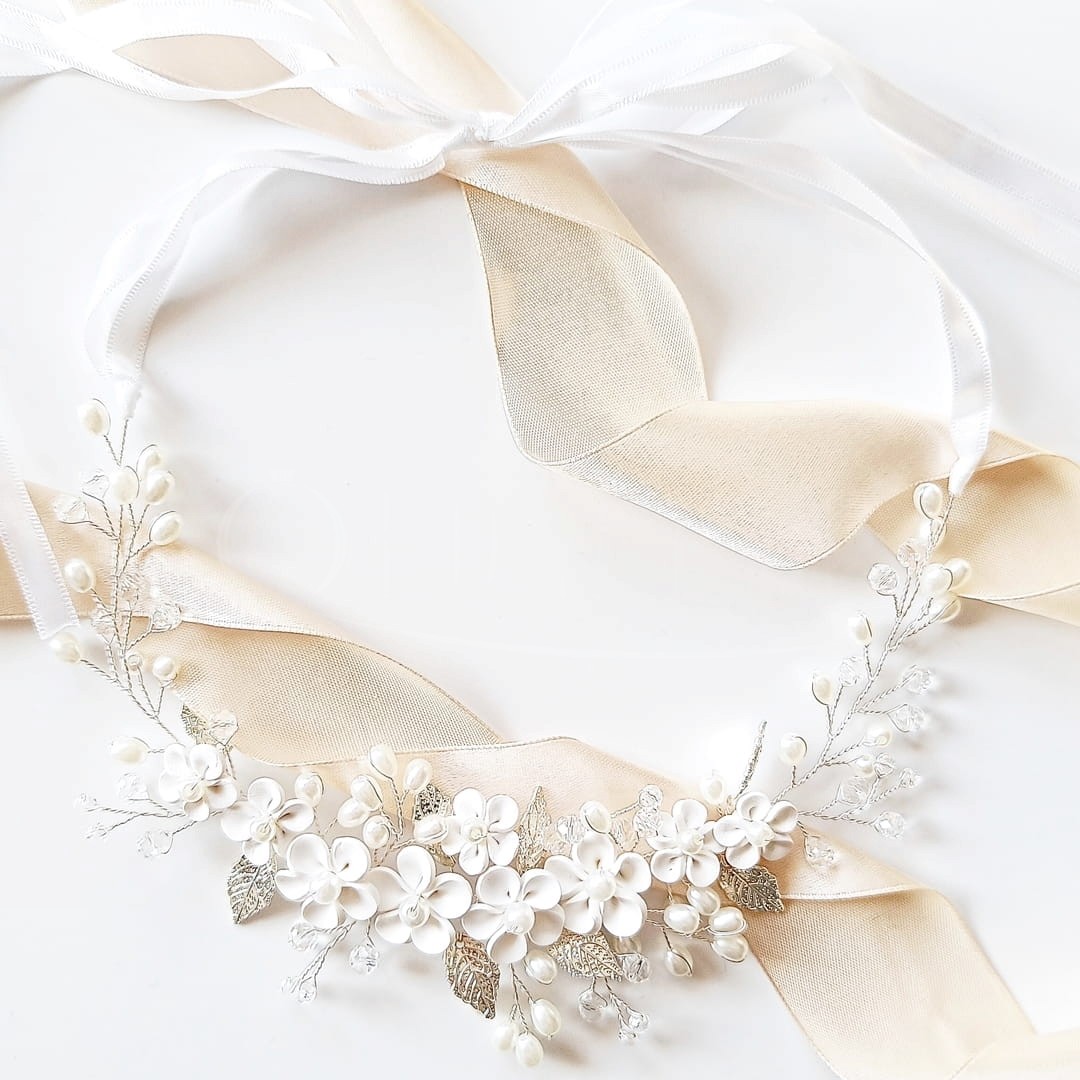 Srebrna opaska z kwiatami sprawdzi się doskonale jako ozdoba do włosów na różne okazje. Poniższy ozdobny wianek może zostać wybrany zarówno do romantycznej sukni ślubnej, jak i stroju komunijnego. Kompozycja kwiatów, pereł i listków to strzał w dziesiątkę.