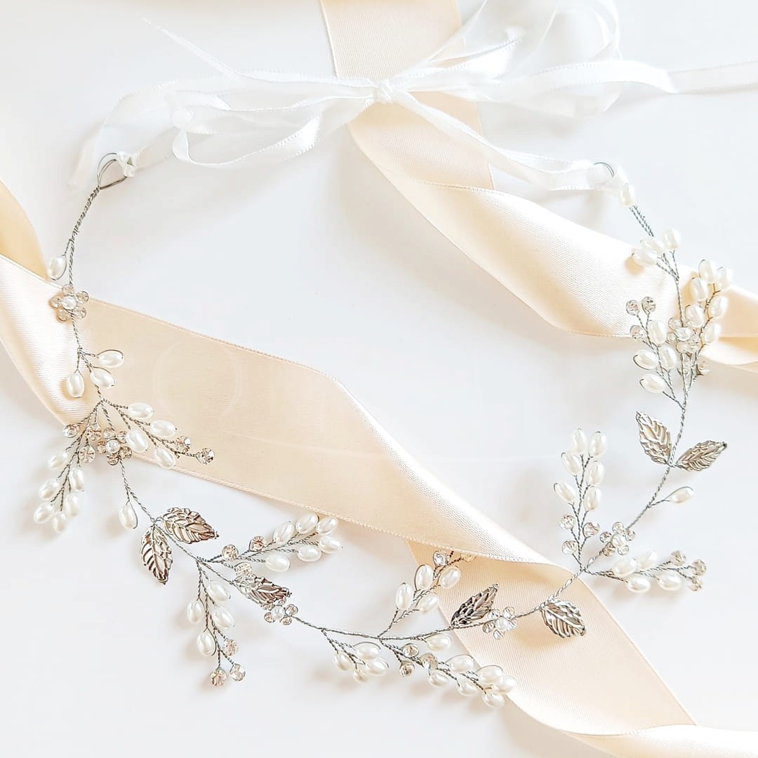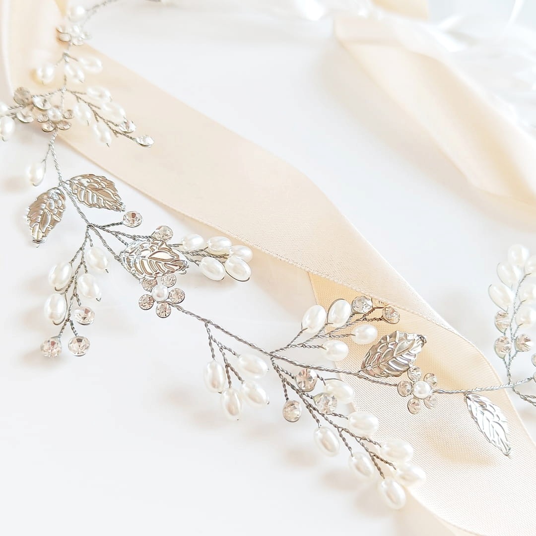 Srebrny biżuteryjny wianek z listkami i perełkami to wybór Panien Młodych posiadających suknie w stylu rustykalnym. Kwiaty i listki naturalnie wpisują się w ten styl, więc ozdoba pięknie będzie współgrać z rozpuszczonymi lekko falowanymi kosmykami.