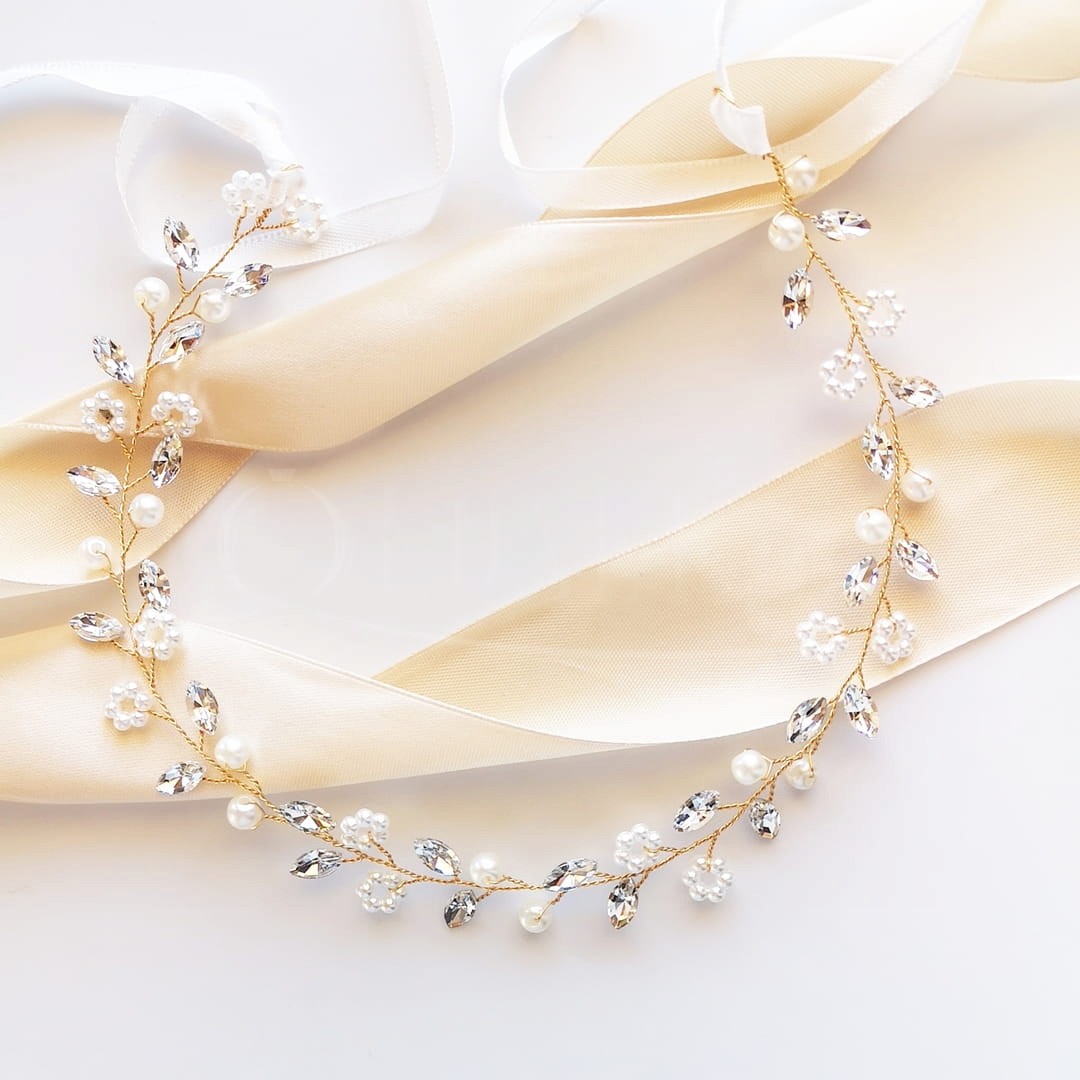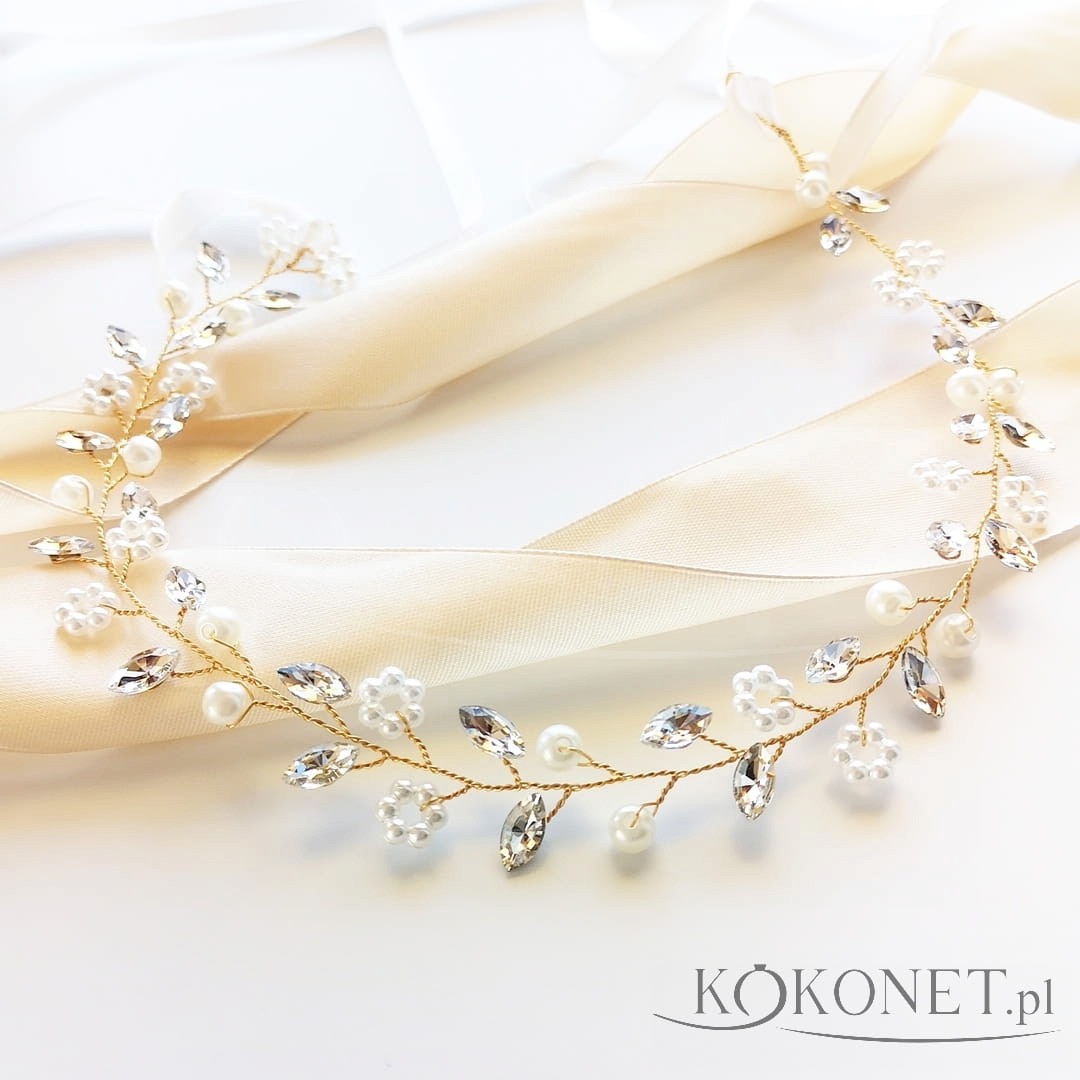 Subtelny wianek z cyrkoniami i perełkami w kolorze złotym będzie dopełnieniem dla każdej stylizacji w klimacie rustykalnym. Możesz założyć go na czoło, lub jako opaskę. Dzięki elastycznemu drucikowi możesz go dowolnie formować.