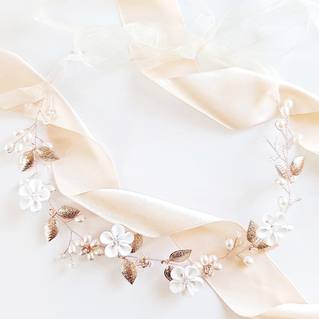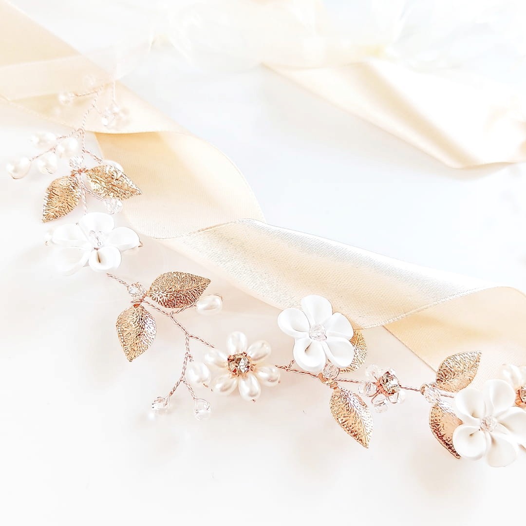Delikatna, ale widoczna - taka jest dekoracyjna opaska w kolorze różowego złota, którą masz przed sobą. Delikatne kwiaty przeplatają się tu z listkami i perełkami tworząc estetyczną rustykalną kompozycję. Elastyczny drucik dopasujesz do swoich potrzeb, a ozdobną wstążkę możesz ściągnąć, aby wykorzystać opaskę, jak girlandę do ślubnego kłosa.