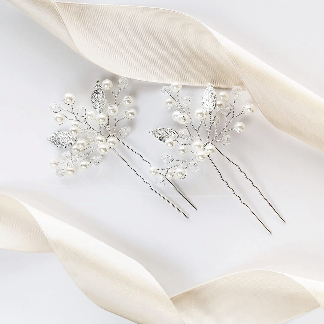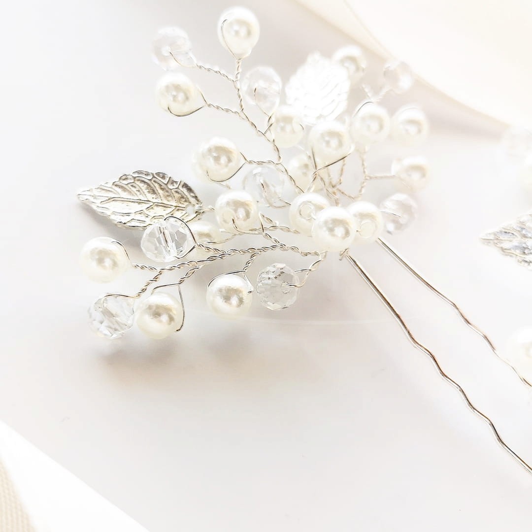 Przedstawiamy kolejny zestaw ozdób do włosów - tym razem są to dwie kokówki z perełkami, kryształkami i listkami w kolorze srebrnym. Ozdoba pięknie będzie prezentować się zarówno wpięta w jedno miejsce jako okazalsza ozdoba np do niesymetrycznego upięcia, jak i w dwóch miejscach tworząc bardziej przestrzenną kompozycję, np. do rozpuszczonych fantazyjnych loków.