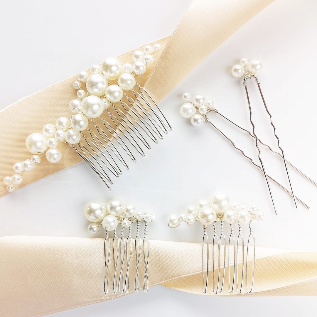 Zestaw ozdób do włosów gdzie głównym motywem są perełki świetnie sprawdzi się zarówno w upięciach, jak i luźniejszych fryzurach. Dzięki kilku elementom składającym się na zestaw możesz dowolnie umieszczać je we włosach tworząc ciekawe kompozycje