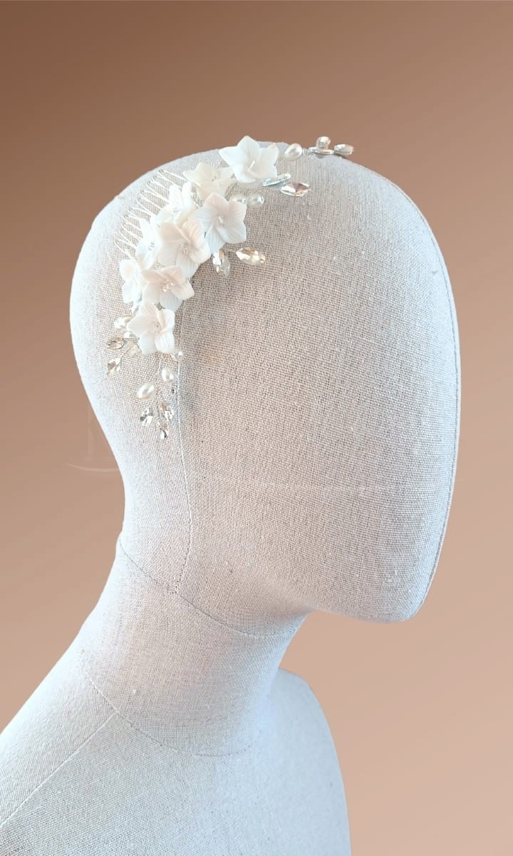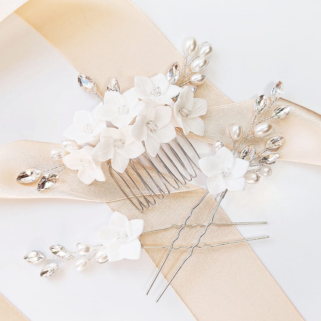 Ten piękny kwiatowy srebrny komplet ozdób do włosów z powodzeniem dopełni twoją ślubną stylizację. Kwiaty z glinki są trwałe i nie straszne im żadne warunki atmosferyczne, a w towarzystwie pereł i cyrkonii prezentują się bardzo wytwornie i elegancko.