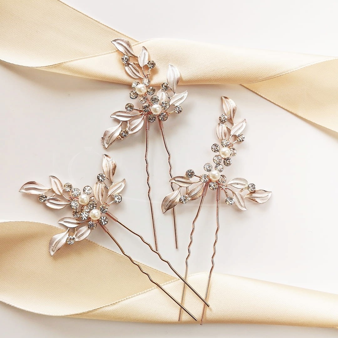 Wybierając komplet wsuwek do ślubnej fryzury możesz być pewna, że stworzysz z nimi coś pięknego. Możesz wpiąć je w jednym miejscu upięcia, lub rozrzucić na warkoczu tworząc ciekawą przestrzenną kompozycję. Temu zestawowi kokówek w kolorze różanego złota przewodzi motyw kwiatów i listków, więc jeśli planujesz lekką i naturalną stylizację z nutką błysku, to będzie to odpowiedni wybór.