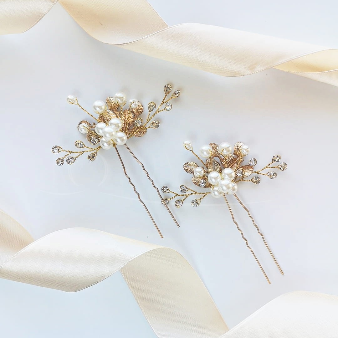 Zestaw wsuwek idealny do koka lub niskiego upięcia. Perełki, cyrkonie i listki tworzą uroczą kompozycję dodającą uroku każdej fryzurze ślubnej. Gałązki można dowolnie wyginać dzięki zastosowaniu giętkiego drucika. W skład ozdoby wchodzą dwie kokówki jak na zdjęciu.