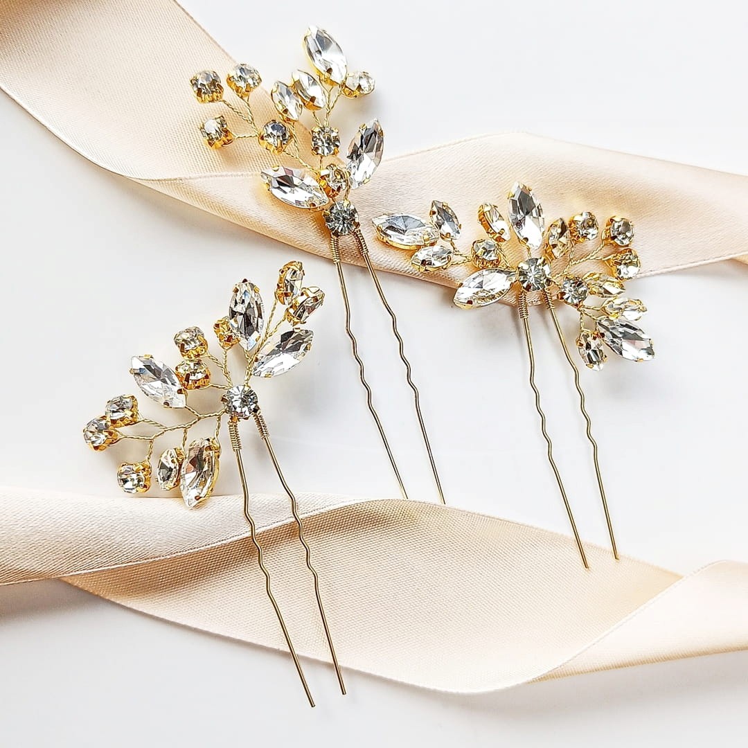 Zestaw złotych wsuwek z cyrkoniami do fryzury ślubnej