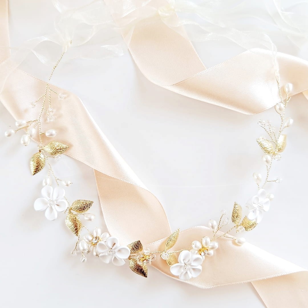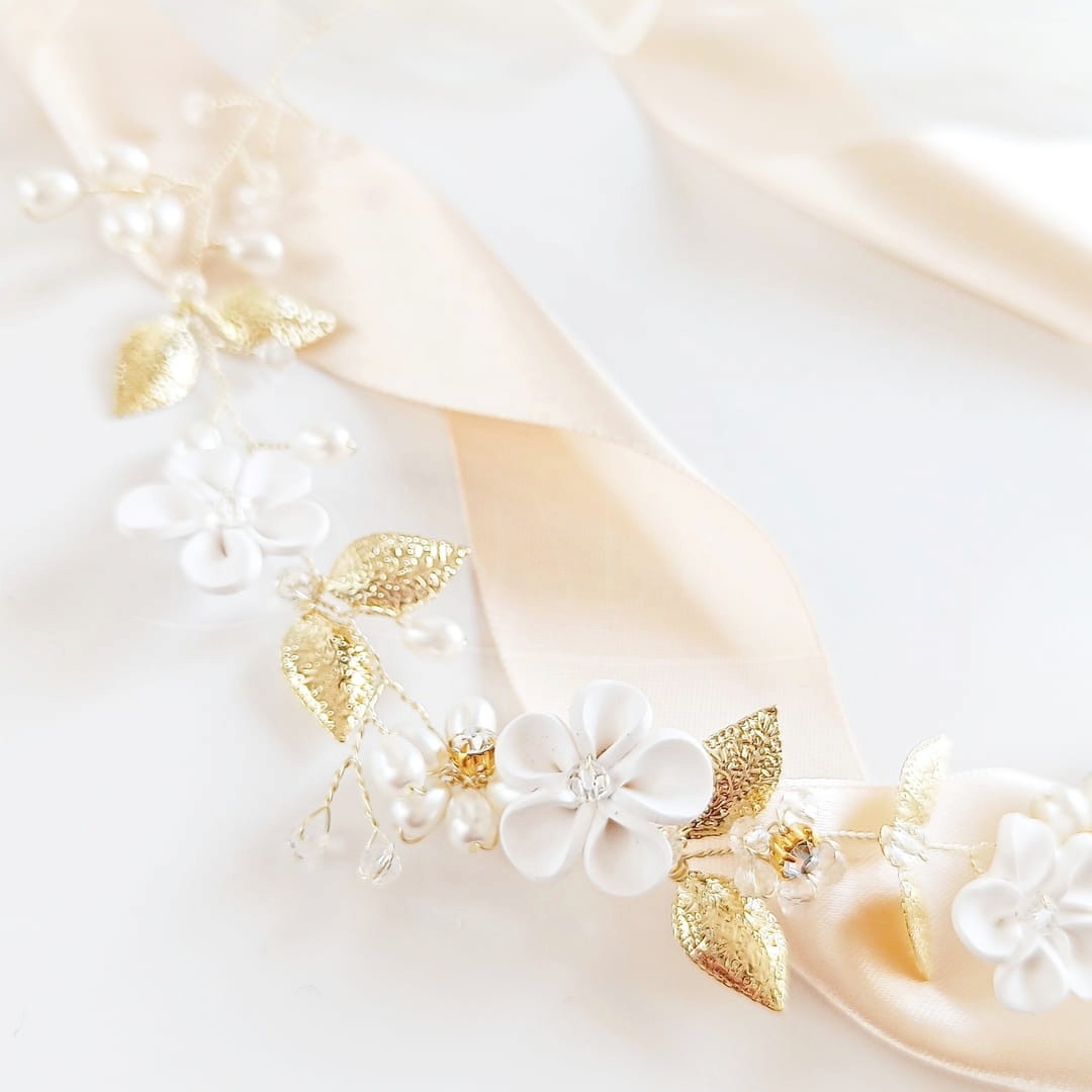 Delikatny, ale widoczny - taki jest złoty biżuteryjny wianek, który masz przed sobą. Delikatne kwiaty przeplatają się tu z listkami i perełkami tworząc estetyczną rustykalną kompozycję. Elastyczny drucik dopasujesz do swoich potrzeb, a ozdobną wstążkę możesz ściągnąć, aby wykorzystać opaskę, jak girlandę do ślubnego kłosa.