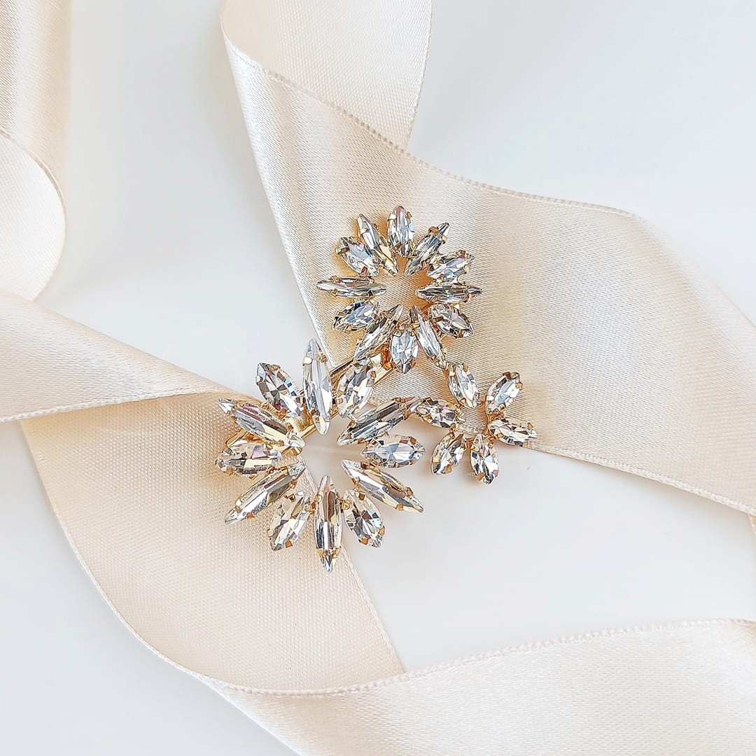 Wymarzyłaś sobie eleganckiego koka, lub gładko zaczesane fale w stylu glam, a teraz szukasz nietuzinkowej ozdoby do włosów? Świetnie trafiłaś - ta złota spinka z pewnością trafi w twój gust. Klamerka dobrze będzie trzymać się we włosach, a dzięki części ozdobnej składającej się z samych cyrkonii spinka doda blasku Twojej twarzy.